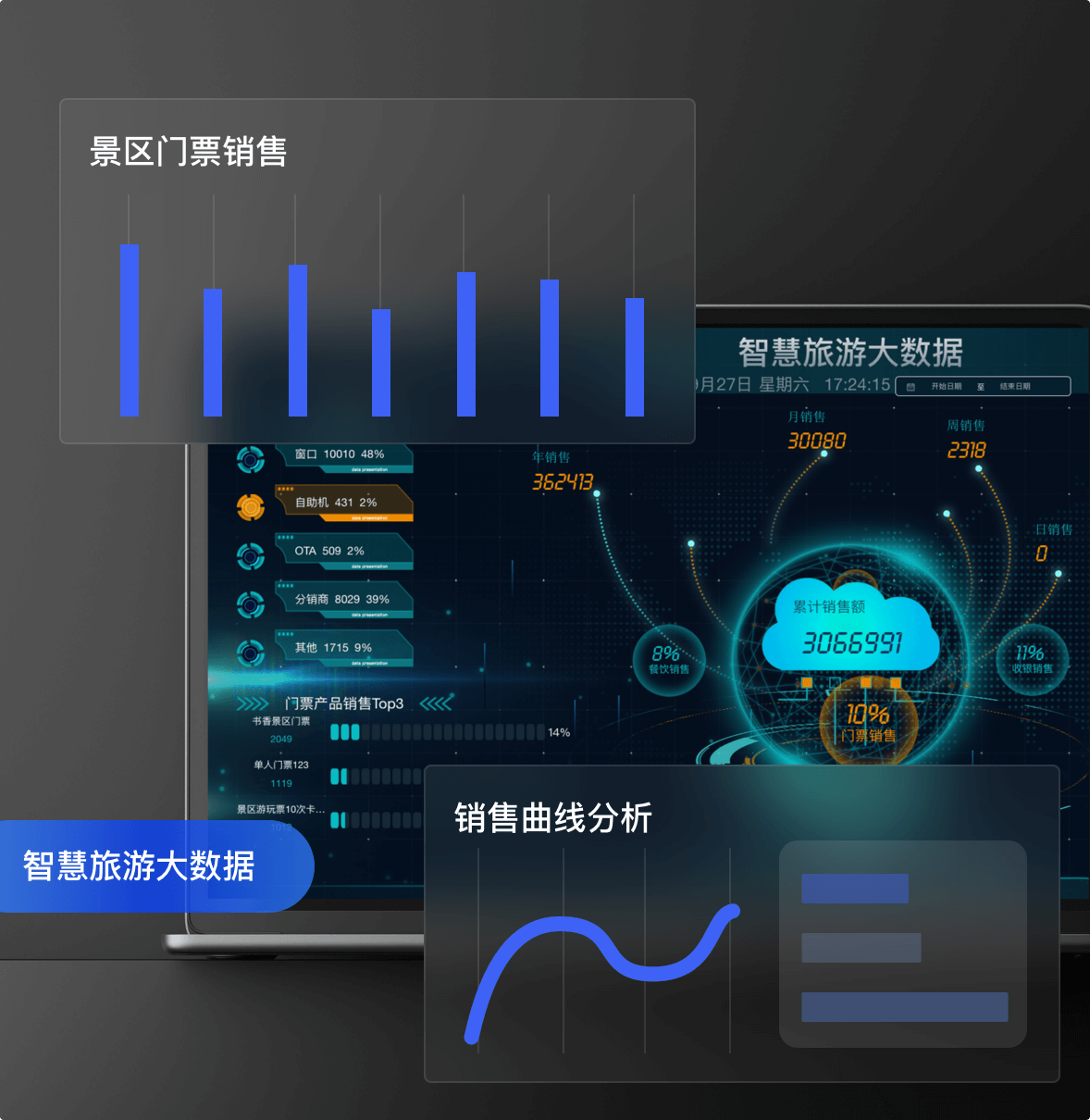查看总销售额、入园人数和人次、商户数量、销售趋势分析、产品销售排行、游客类型分析等整体数据