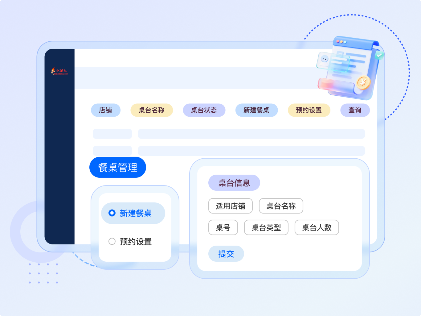 - 桌台管理:新建桌台、设置人数及桌台不同状态、支持不同日期和时间段预定桌台