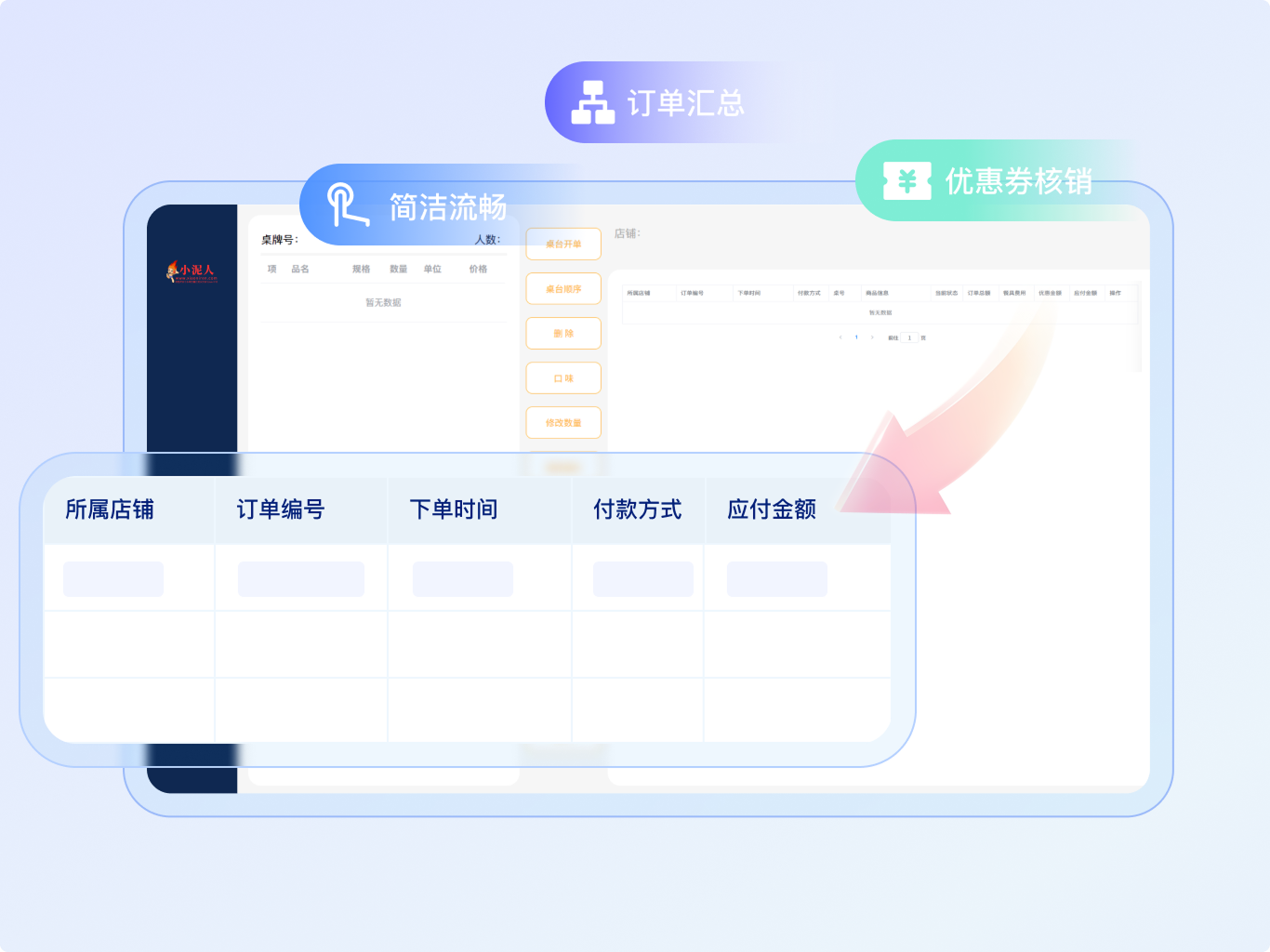 - 收银台桌面管理收银台支持全屏桌面化管理,桌台开桌、调整菜品,全操作一屏搞定,餐中管控不卡顿