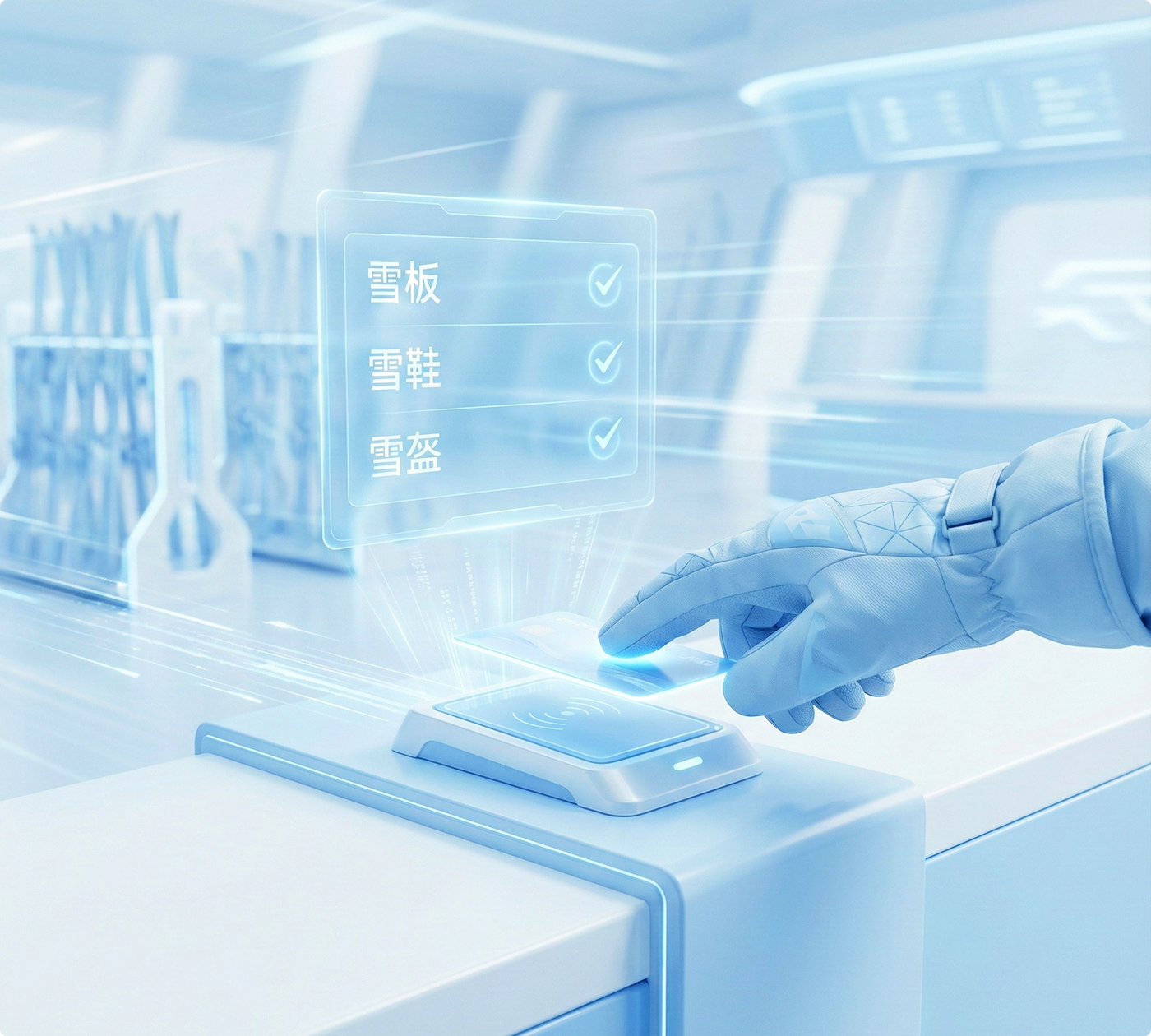 顾客完成购票并激活租赁卡/手环后,即可凭卡前往雪具租赁大厅,扫描IC卡,系统即刻显示其预定的套餐清单,快速领取已绑定或选定的装备,省去现场选择沟通时间,彻底告别排队沟通的繁琐。